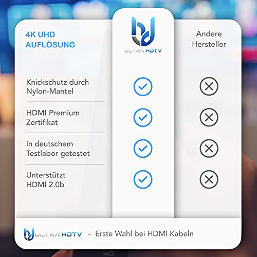 Wij van Ultra HDTV, het toonaangevende Ultra HD-magazine van Duitsland, hebben voor onze lezers een HDMI 2.0-kabel ontwikkeld die ook en speciaal is ontworpen voor 4K-televisies en uitzendt op 60Hz. In tegenstelling tot veel concurrenten die al voldoen aan de HDMI 2.0-standaard met de overdracht van 4K in slechts 30Hz en hiermee adverteren, bent u goed uitgerust voor de toekomst met onze kabel. Dit is precies wat we hebben laten testen door een Duits testlaboratorium met verschillende invoerbronnen en 4K-tv’s van verschillende fabrikanten als uitvoerapparaat. Uittreksel uit het testrapport: