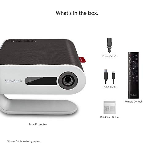 Inhoud: ViewSonic M1+ LED-projector, USB-C-kabel, netsnoer, snelstartgids (mogelijk niet beschikbaar in het Nederlands), afstandsbediening, draagtas
