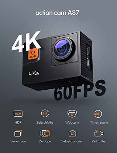 Specification: Action Cam A87, UHD 4K 60fps touchscreen WiFi onderwatercamera 20MP digitale waterdichte 40M helmcamera (2.4G…