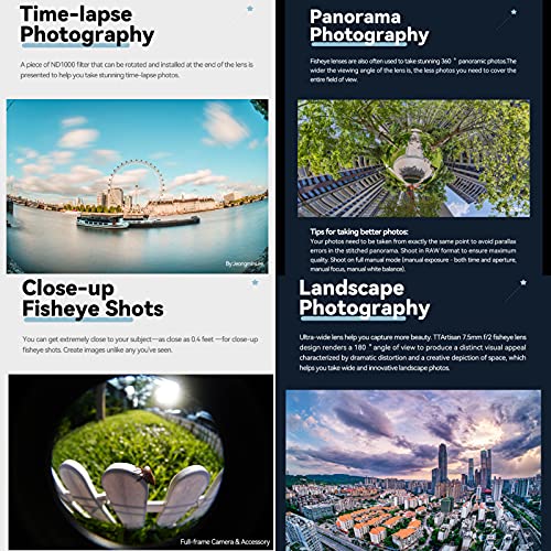 【CircularFisheye Creation】Hoewel deze lens is ontwikkeld voor APS-C-sensoren, kunnen gebruikers het ook gebruiken om cirkelvormige visgraatbeelden op te nemen. TTArtisan 7,5 mm F2.0 cameralens compatibel met E-Mount A5000, A5100, A600, A6100, A63 0, A6400, A6500, A6600, NEX-3, NEX-3N NEX-3R, NEX-5T, NEX-5R, NEX-5. NEX-5N, NEX-7, NEX5CA7, A7 (7M2), A7Il (A7M3), A7R, A7RI(A7RM2), A7RI(7RM3) A7RIV(A7M4), A7S, A7SI(47SM2), A7SI(A7SM3), A9.